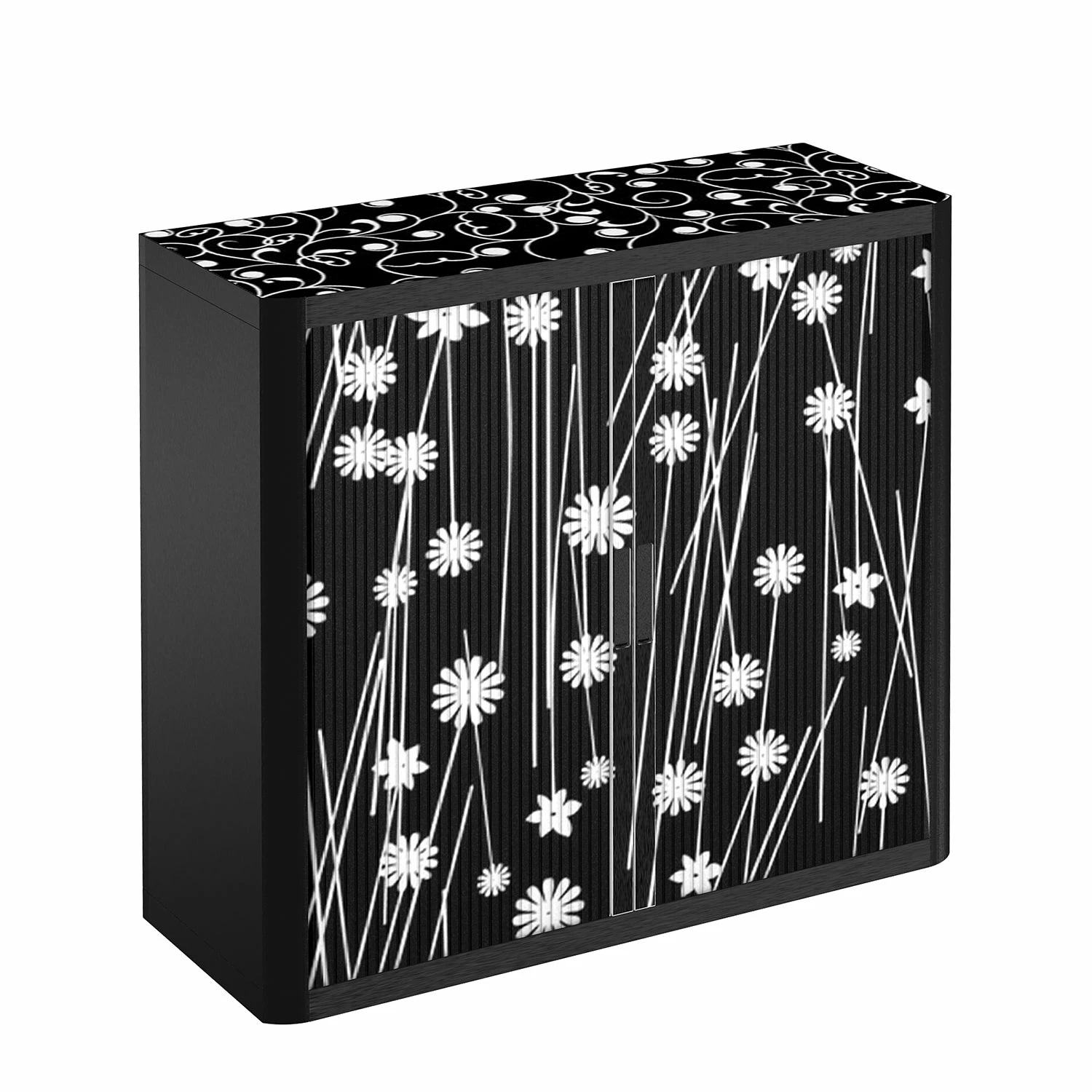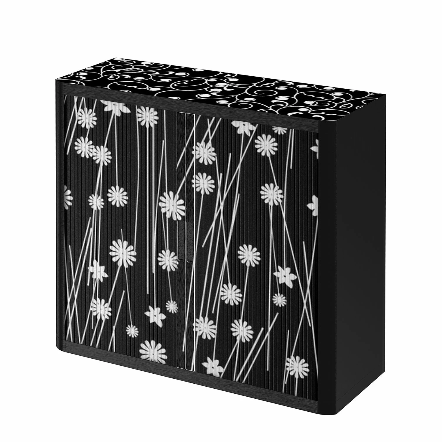 - Oberplatte & Front: Schwarz mit weißen Blumen