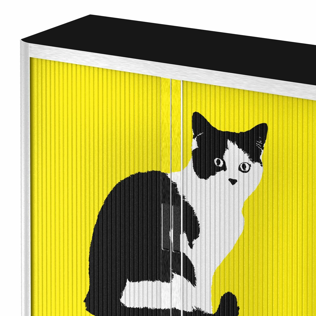 - Korpus: WeißOberplatte: SchwarzFront: Gelb mit schwarz-weißer Katze
