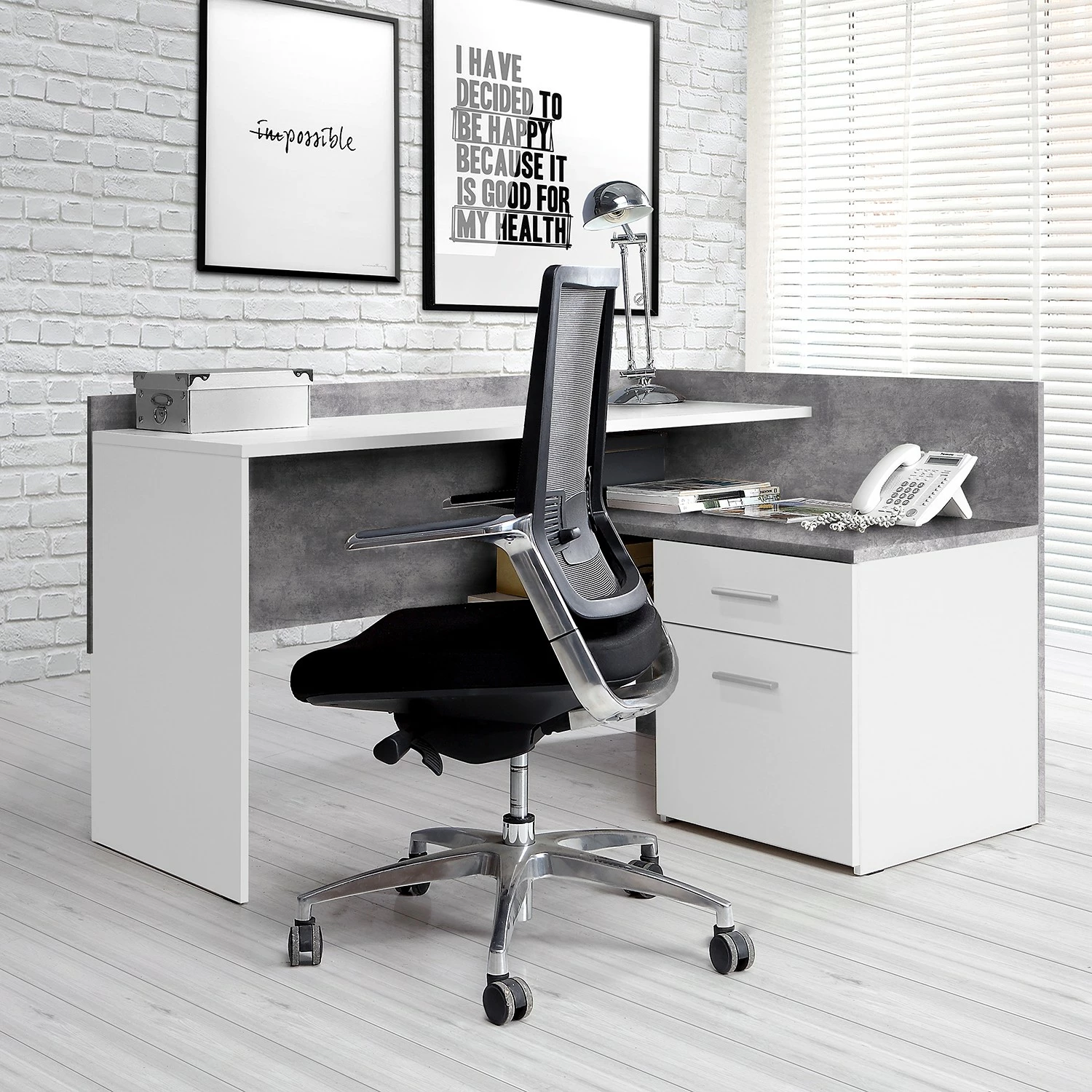 - Tischplatte & Front: Weiß