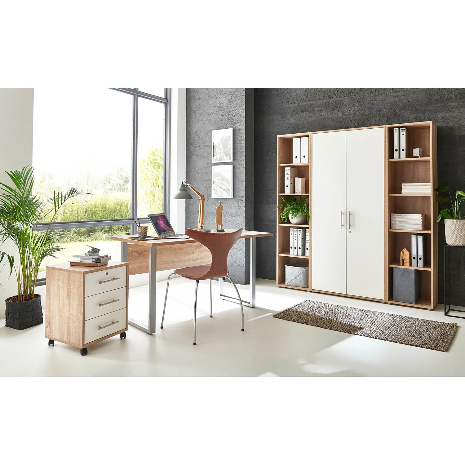 - Lieferumfang: 5-teiliges Set bestehend aus: 1 Schreibtisch, 1 Rollcontainer, 2x Regal & 1 Aktenschrank