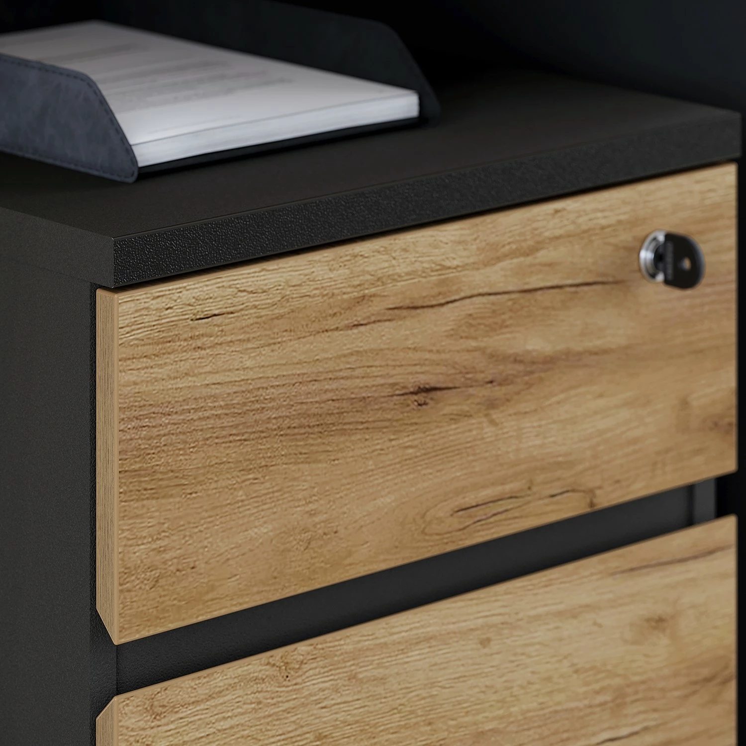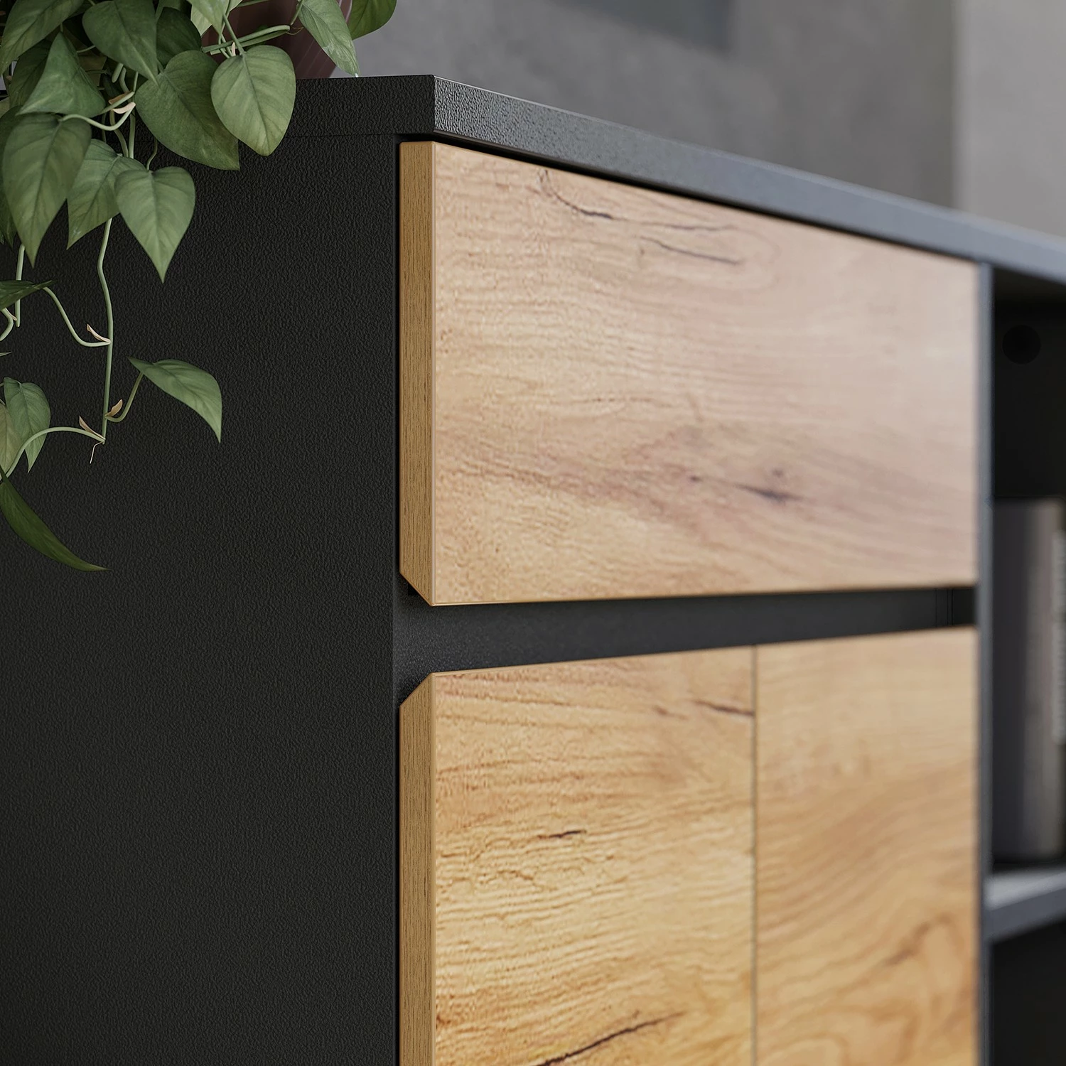 - Tischplatte & Front: Eiche Navarra Dekor